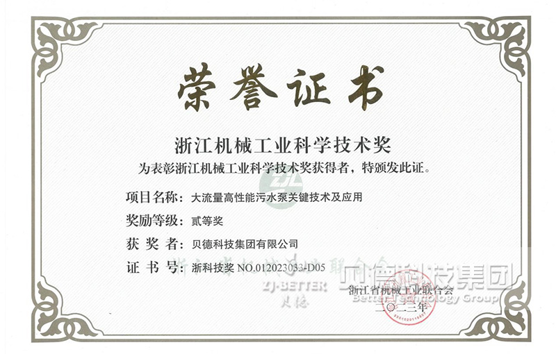 項,貝德科技集團有限公司憑借“大流量高性能污水泵關(guān)鍵技術(shù)及應(yīng)用”項目榮獲二等獎。