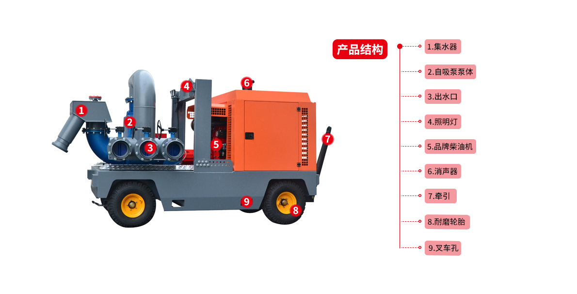 應急移動防汛泵車,是我公司根據多年的搶險經驗和廣大用戶的建議,經過多次技術改進后推出的最新產品,具有整車質量輕、抽水流量大、揚程高、越野性能好、機動性能好、牽引裝卸快捷、操作使用簡單、環(huán)境適應能力強等等特點,是現(xiàn)階段防汛抗旱的主力軍。防汛排澇移動泵車采用高端中外合資高品質柴油機發(fā)動機,通過船用高彈聯(lián)軸器直接驅動雙吸自吸式離心泵。配置最高時速可達50公里/時的高速全掛式牽引拖車,可輕松通過碎石路面,水泥路面,泥濘路面等惡劣環(huán)境。配用1變3分水頭,將大口徑的進出水管變成小口徑,并選用高強度輕質塑筋軟管,配備不銹鋼快速拆卸接頭,可降低操作人員數量及勞動強度,2-3人就可輕松操作。配備油潤滑式旋片式真空泵直接抽取泵內和進水管路內的空氣,泵內不需要再灌引水。